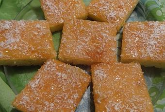 5- Remove the cake from the oven. Spread jam on top of the cake and sprinkle with coconut.