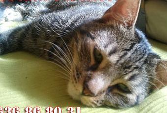 Perdido gatito en Madrid (zona Atocha-Lavapiés). De raza común, y pelaje atigrado en color gris-pardo (uñas oscuras).