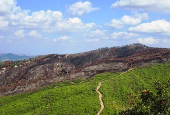 Una imagen vale mas que mil palabras, pero en este caso en la foto no se aprecian las consecuencias del incendio, para tener una idea hay que subir allí arriba y pisar las cenizas de lo que en su día fue un bosque frondoso. La foto de abajo es una captura de pantalla del Google Maps donde se puede ver el Puig Vicenç antes del incendio, ahora solo quedan arbustos quemados y varios cortafuegos que hicieron los bomberos para detener el fuego. Sin palabras.