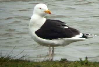 Gaviota de gran tamaño, de dorso oscuro, las patas son rosadas, a diferencia de la gaviota sombría y patiamarillas de color amarillo. Larus marinus. Gavión atlántico. Great black-backed gull. Gavinot.
