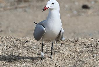 Inconfundible gracias a su anilla de PVC blanca, claramente visible en las fotos que he tomado hoy. También lleva una anilla metálica en la otra pata, lo que Su plumaje característico, con el cuerpo blanco, las alas gris pálido y el pico rojo con punta negra, la hace destacar mientras camina con elegancia sobre la arena, como se aprecia en las imágenes donde busca alimento o extiende sus alas bajo el sol de la mañana.