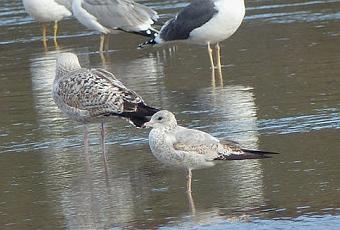 No debemos confundirlas con las más abundantes gaviotas canas Larus canus, que este otoño parecen haber llegado en gran número, hasta 5 ejemplares pude anotar el pasado domingo, todos ellos de primer invierno. Estas por lo general son un poco más oscuras en el dorso, tienen menos moteado y el pico más fino; y si se me permite la expresión, cara de canas.