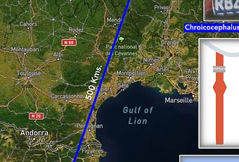 | Mapa de la migración de la gaviota reidora (Chroicocephalus ridibundus) marcada con la anilla "RBZB", aproximadamente 500 kilómetros desde su lugar de anillamiento en Boisset-lès-Montrond, Francia, hasta el Parc Diagonal Mar, Barcelona. La imagen muestra la ubicación del anillamiento, el desplazamiento migratorio y la observación actual en Barcelona. |