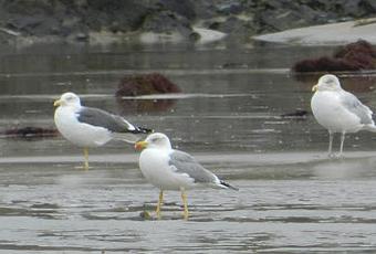 Una especie que se presenta en muy pequeño número, pero regular, es la gaviota argéntea Larus argentatus. Los más fáciles de identificar son los adultos; hace un par de días pude hacer en la playa de Bañugues unas fotos a tres ejemplares adultos juntos de distintas especies.