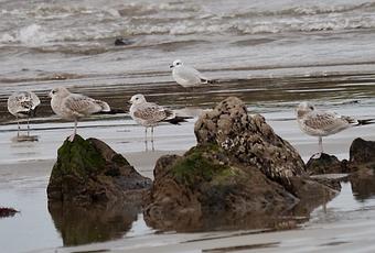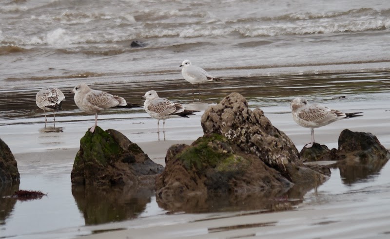 La última está reposando pero probablemente es la que mejor se distingue, con esa bufanda en el cuello. Las gaviotas canas conviven sin problemas con las otras gaviotas pequeñas presentes en la playa, reidoras y cabecinegras.