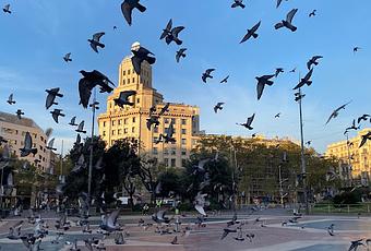 Vista general de la Plaça de Catalunya al amanecer, con numerosas aves volando. Muestra la gran concentración de avifauna en este emblemático punto de la ciudad.