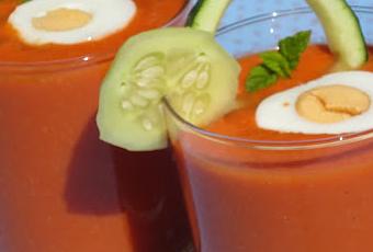 Servir bien frío, y si se quiere menos espeso, a la hora de servirlo poner unos hielos, con huevo cocido, jamón en lascas, verduritas picadas.........