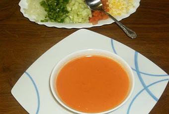 Para guarnición pelamos un tomate, lo cortamos en cuadraditos pequeños (concasse)Cortamos, cebolla, pimiento, verde y huevo duro, todo del tamaño del tomate, y si nos gusta unos cuadraditos de pan, servimos aparte, para que cada comensal se sirve lo que mas le guste.