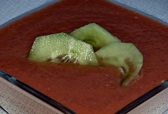 El gazpacho es un tipo de preparación culinaria consistente en la elaboración de una sopa cuyo ingrediente principal es el tomate. Se suele servir fresco en los meses calurosos de verano. Su color varía desde el naranja pálido al rojo, según se empleen tomates más o menos maduros. El origen del actual gazpacho es incierto, aunque tradicionalmente se le ha considerado un plato del interior de Andalucía donde el aceite de oliva y los productos de la huerta son abundantes. Por esta razón se le conoce comúnmente como gazpacho andaluz. Con estos días de calor que están haciendo me apetecía probar un gazpacho ya que nunca lo había probado, pues pensaba que no iba a ser de mi agrado, pero confieso que estaba muy rico y sobre todo fresquito.