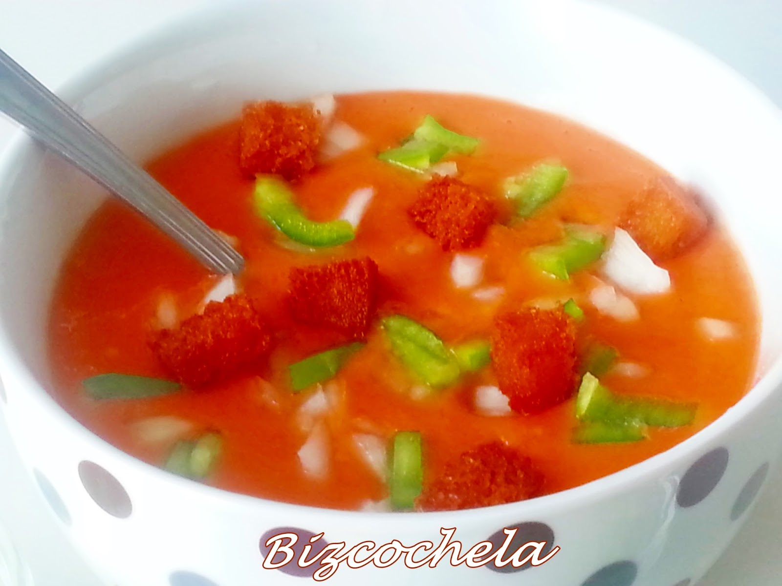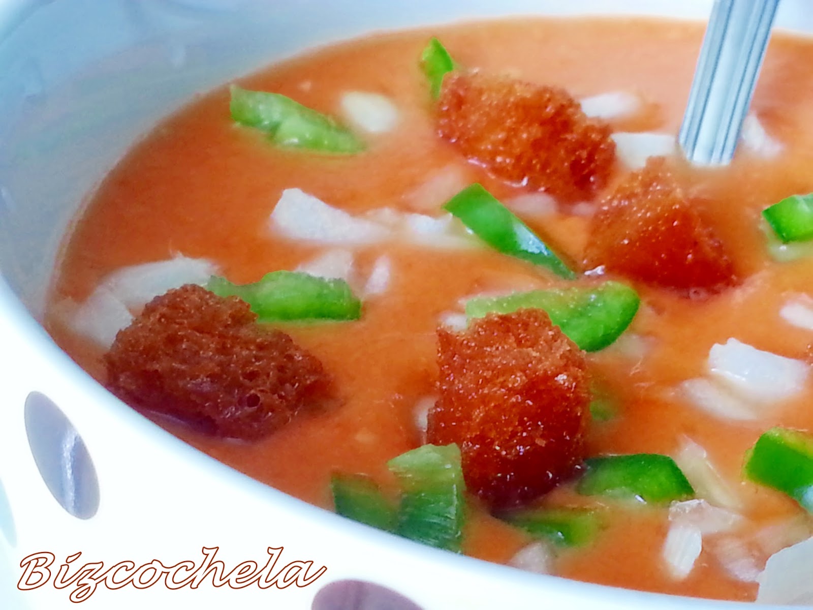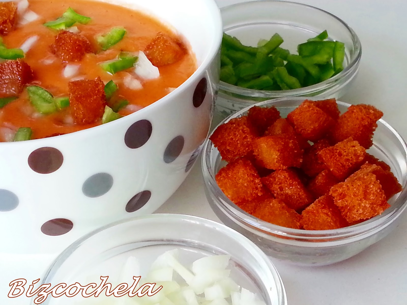 Hay veces que lo hago más líquido, para beberlo como acompañamiento de las comidas, y otras, como en esta ocasión, lo pongo de primer plato acompañado de diferentes ingredientes troceados para hacerlo más contundente.
