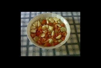 En un bote se le añade aceite, vinagre,agua fría y sal al gusto al la mayoría de los trocitos de verduras/fruta y se bate todo.
