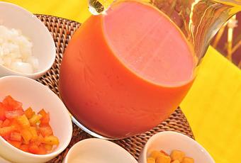 Se acompaña con cebolla, pimiento y pepino picados finamente y trocitos de pan frito.