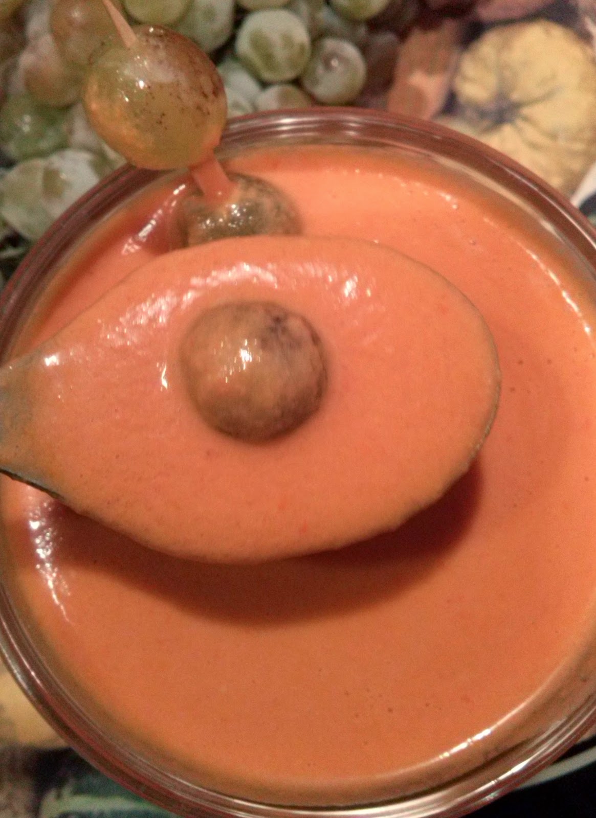 Picar los huevos duros y el jamón.Servir en cuencos o copas con las uvas dentro y dispuestas en palillos para decorar junto con la guarnición de jamón y huevo duro.