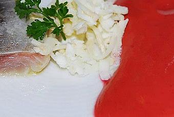 Con cuidado se le quita una fina película que tienen encima de la piel. Se queda el dibujo de la piel pero se quita esa molesta membrana que sería desagradable en la boca. Se cortan las porciones de caballa que van a ir en el plato. Se les pone un poco de limón y aceite de oliva. Se dejan marinar.Para montarlo se coloca el trozo de caballa en el centro del plato, al lado el queso de cabra y una ramita de perejil. Se sirve a vista del cliente el gazpacho de cerezas fresquito en una jarrita.