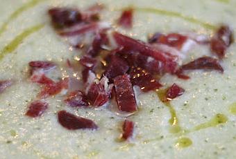 Lavamos y pelamos los ingredientes y quitamos la cáscara y las pipas al melón. Troceamos todo y lo llevamos a la batidora. Añadimos la menta, el aceite, el vinagre y la sal y batimos. Lo probamos, podemos añadir agua si ha quedado fuerte o espeso. Servimos y acompañamos de jamón.
