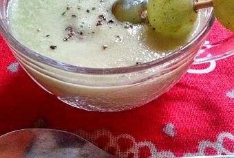 Pon el melón, el pepino, pimiento verde,pan y ajos en el vaso. Tritura con velocidad progresiva 5-10.Añade el aceite y vinagre y programa 2 minutos , velocidad 6.Saca del vaso y ponlo en cuencos individuales.Espolvorea un poco de pimienta recién molida por encima y pon unas uvas. Mete en el frigorífico y sirve bien frío.