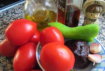 - Tomates rojos 500 g.- Remolacha cocida 1 mediana.- Ajos 2, sin el germen.- Pimiento verde un trozo.- Agua fría 1 litro.- Aceite de oliva 6 cucharadas.- Vinagre de Jerez 3 cucharadas.- Sal al gusto.- Nata para decorar.