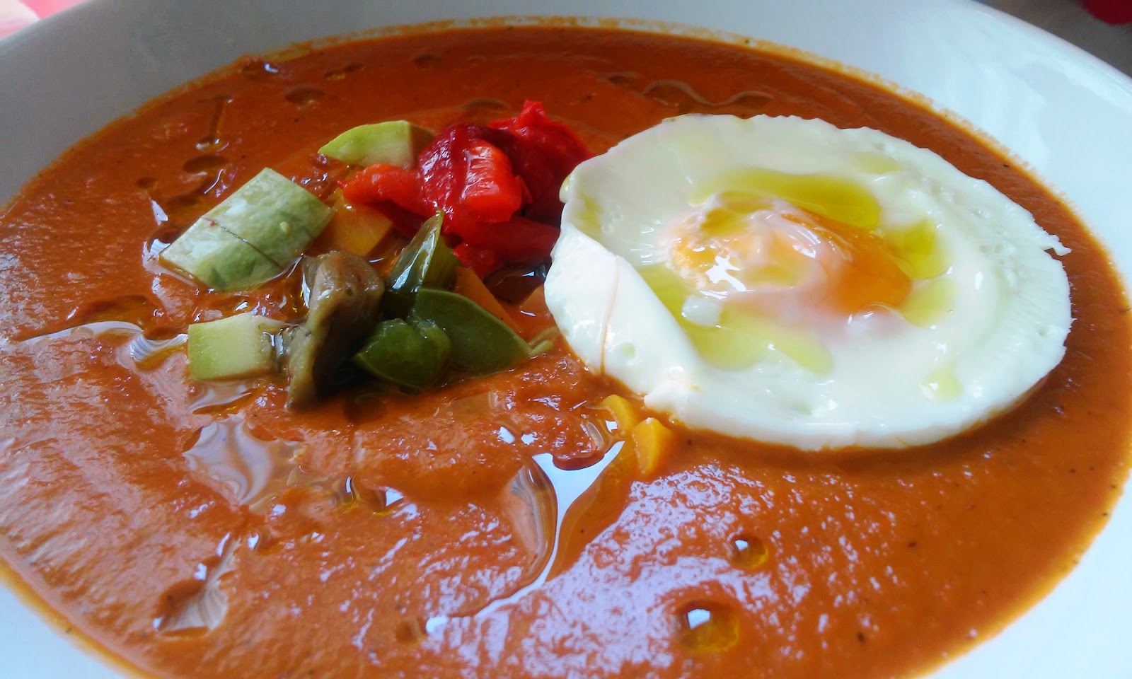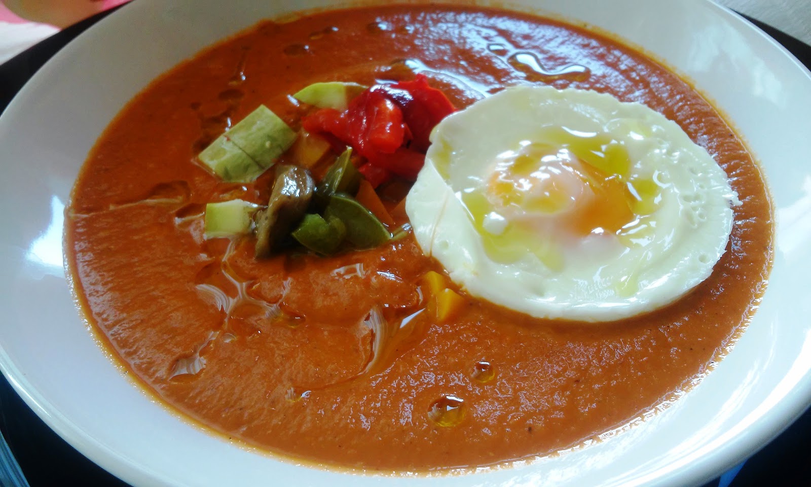 1,5 - 2 k. de tomates rojos1 cebolla fresca2 dientes de ajo1 berenjena1 calabacín blanco1 calabacín negro1 pimiento verde de asar1 pimiento rojo de asar2 zanahorias1 pepinoaceite de olivavinagre de vinosalhuevos ( 1 por comensal )