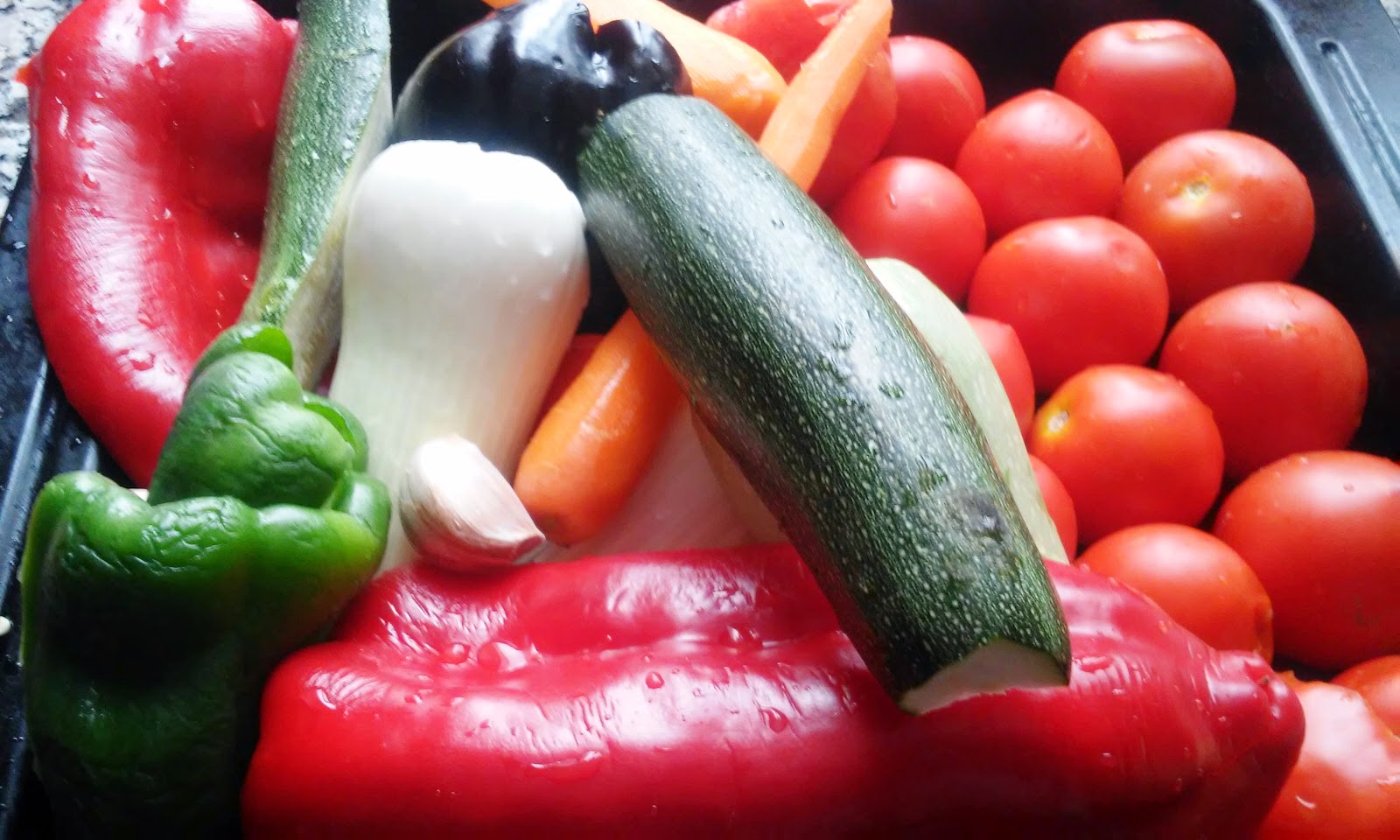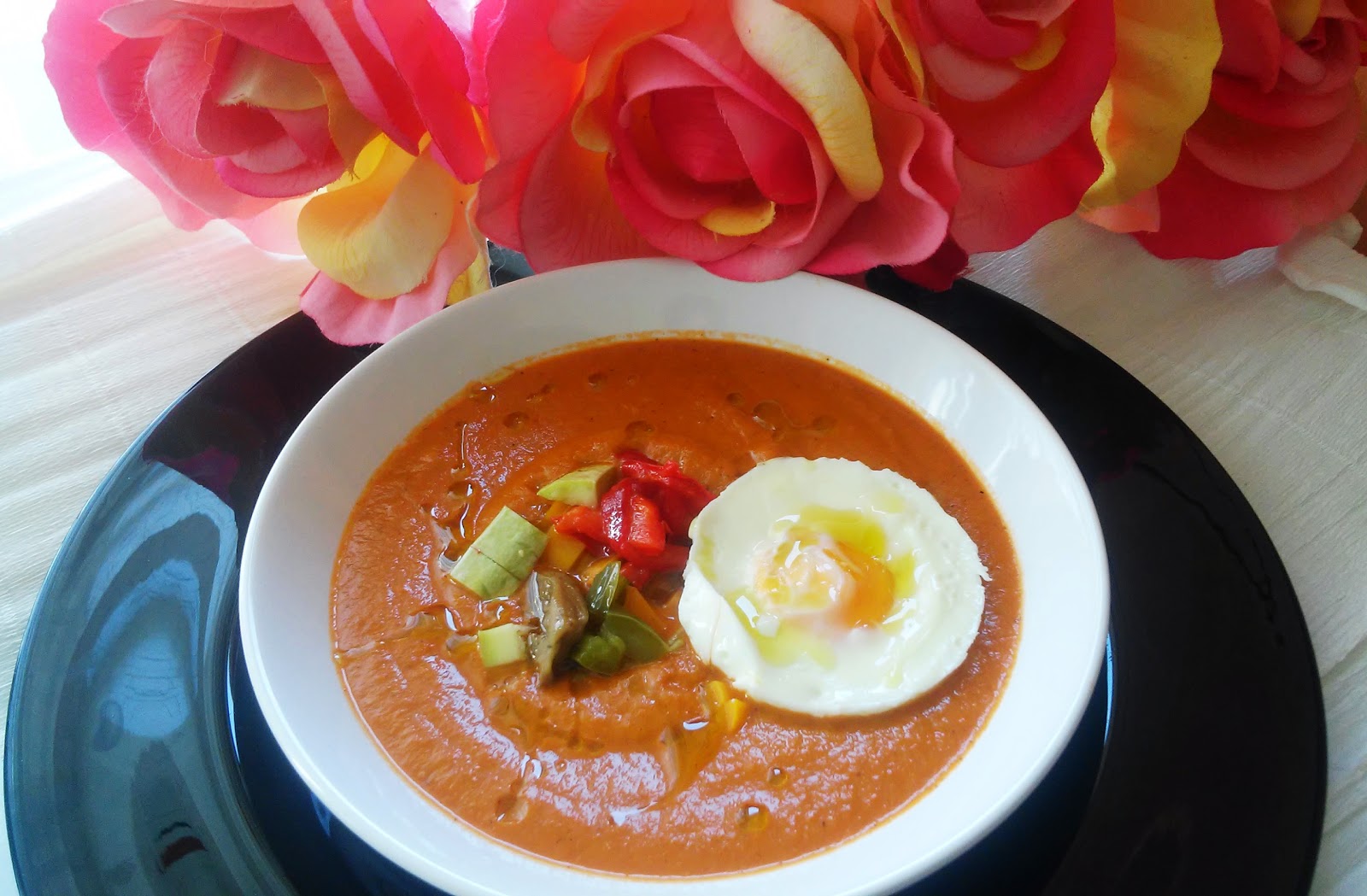 Lavamos todas las verduras, cortamos los calabacines, berenjena , pimientos y cebolla por la mitad y lo colocamos todo en la bandeja del horno. Lo único que no asaremos es el pepino que irá crudo.Pon sal , rocía con aceite de oliva y vinagre al gusto.Introduce en el horno a 180º, hasta que todas las verduras estén asadas. En mi horno sobre una hora pero ya sabéis que cada horno es un mundo y cada uno conoce el suyo en cuanto a tiempos y temperatura.No quites la piel a ningún ingrediente , excepto a los ajos. Separa unos trocitos de cada verdura que después usaremos en la guarnición. Pon todo en el vaso de la batidora y tritura junto al pepino que sí pelamos, hasta que consigas la textura que te guste. Particularmente a mí me gusta fino. Igualmente puedes triturar con Thermomix si tienes.Rectifica de sal, aceite y vinagre y bate todo un poco más.Presenta en cuencos individuales y acompaña con la verdura que reservamos cortada en cuadraditos pequeños y un huevo por comensal. Pon un hilo de aceite de oliva antes de servir.