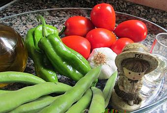 - Tomates de pera, 1 kg.- Ajos, 1 diente.- Pimiento verde, 1 trozo.- Aceite de oliva, 6 cucharadas soperas.- Vinagre de vino blanco, 3 cucharadas soperas.- Agua fría, 1 litro.- Sal.- Habas frescas desgranadas, 50 g o más, al gusto.