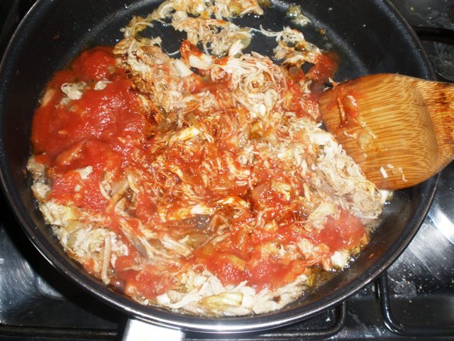 Cuando la carne esté frita, añadimos el pimentón y el tomate: