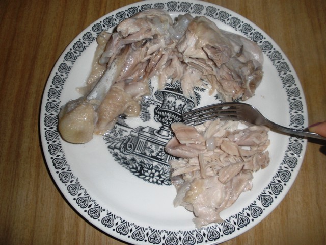 Cocemos la carne hasta que esté blanda y podamos separar la carne de la piel y los huesos: Colamos el caldo de la cocción para evitar los pequeños huesos de la cocción: En una sartén, freímos la cebolla y cuando esté dorada incorporamos la carne: Cuando la carne esté frita, añadimos el pimentón y el tomate: Y añadimos el caldo de la cocción: Y cuando hierva, ponemos la pasta:Espolvoreamos las especias: