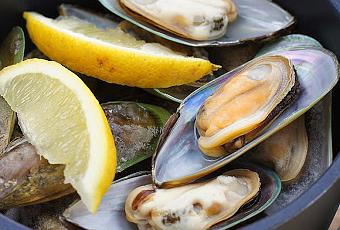 Coceremos al vapor los mejillones bien limpios con un chorrito de limón y la hoja de laurel. Una vez que rompa a hervir los mejillones se abrirán, apagaremos el fuego y quitaremos las conchas de los mismos, reservaremos.