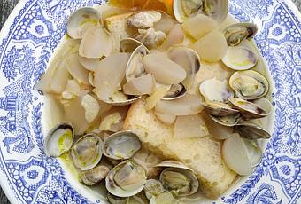 echando los rábanos, ajos y almejas encima; por último el caldo. Acompañar con un trozo de naranja.