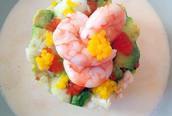 A la hora de servir:Poner en el centro ayudándose con un molde el aguacate, el pescado y los langostinos. Retirar el moldo, colocar los langostinos encima, adornar con las perlas de yuzu y las huevas de salmón