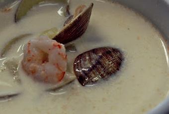 Estará lista cuando la textura es cremosa.Se puede añadir un poco de vinagre en vez del limón. Se debe consumir momento y NO guardarla para otro día.Y para el gazpachuelo se cubren las patatas con agua y se ponen a cocer. Una vez que están tiernas, se añaden las almejas y las gambas. Se deja cocer un minuto para que se cocinen. Se añade sal y se aparta para que temple. Es muy importante que baje la temperatura porque si no, al añadir la mayonesa al caldo caliente, se harían grumos. En un recipiente se pone medio vaso de mayonesa y se va añadiendo poco a poco un cazo de caldo. Se remueve con unas varillas para que se vaya diluyendo la mayonesa. Se añade otro cazo de caldo y se mezcla de nuevo. Una vez se ha diluido, se incorporar a la olla poco a poco, sin dejar de remover. Se vuelve a hacer el mismo proceso con el otro medio vaso de mayonesa.Una vez se le ha añadido toda la mayonesa se rectifica de sal, se remueve un poco y se le añade un poco más de mahonesa, ya, según gustos. Si se quiere calentar la sopa de nuevo se tiene que hacer con fuego suave y sin que hierva.Al igual que la mahonesa sola, este plato se debe consumir en el momento y no se debe guardar para otro día. Si vemos que nos va a sobrar, se guarda el caldo por un lado y al día siguiente se prepara una nueva mahonesa.
