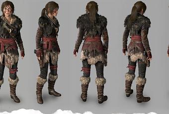 “El traje de depredador del ápice rescata elementos de los osos autóctonos con los que Lara se encuentra en el áspero paisaje siberiano. El pelaje oscuro contrasta con los detalles en rojo en la faja de la cintura cintura y de la pierna, lo que refleja los altercados violentos entre Lara y la fauna depredadora. Las garras de un oso cuelgan alrededor de su cuello como signo de victoria y como advertencia a cualquiera que se le oponga. A modo de ritual, muestra la sangre de la caza en su cara para intimidar a los enemigos. Una bota de tacón de dos hebillas se envuelve con cueros, cubierta con piel para un calor adicional. El depredador del ápice representa a Lara en su forma más salvaje”.