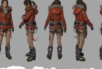 “Lara se prepara para su peligroso viaje sabiendo que tendrá que enfrentarse a situaciones climáticas extremas. La construcción de la chaqueta de expedición: resistente al agua y de pluma de ganso, proporciona calidez y maniobrabilidad para el largo camino por delante, y cuenta con un parche circular blanco y negro en el brazo izquierdo. El color rojo proporciona un contraste de color a un paisaje de otro modo fresco. Completa su look con unos cubrebotas (polainas), crampones, arnés de escalada, tornillos de hielo, una correa de escalada, un gorro gris, gafas para la nieve, y sus piolets gemelos“.