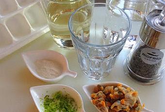 Ponemos a calentar el agua de mar con el vermut a fuego medio-alto. Diluimos el agar-agar en el agua y lo incorporamos a la mezcla anterior. Sin dejar de remover llevamos a ebullición y cocinamos durante dos minutos. Dejamos templar mientras colocamos en el fondo de los huecos de las cubiteras un poco de alma de caviar, un poco de ralladura de lima, un par de berberechos y cubrimos con el líquido. Tapamos y metemos en la nevera para que se solidifiquen y una vez frías, desmoldamos con ayuda de un cuchillito (separando los lados del molde) y podemos servir en cucharillas individuales cubiertas por una patatita paja. La hora del vermut en un sólo bocado.