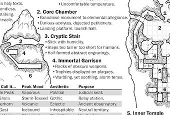 Pasamos a juegos de rol con este mapa, que incluye un corte transversal,descripciones y una tabla. Es obra de Skerples ( Texto) y de Dyson Logos ( Mapa y corte transversal).Es para usar una montaña o pico solitario en vuestras partidas.Un lugar inhóspito,pero ese pico tine en su interior cámaras y estancias, al parecer.Para que sirve? Que hay dentro? Quien esta dentro? O que...