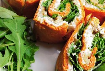 Quitamos el papel de hornear y estiramos un poco nuestro bizcocho. Extendemos por todo la crema de queso, luego le ponemos las nueces y finalmente la rucula. Con cuidado volvemos a enrollar.