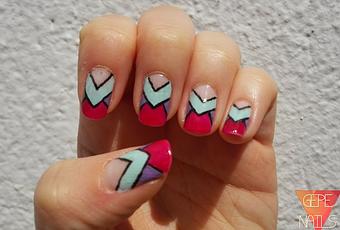 A continuación, pintamos un triángulo en rosa fucsia que empiece en la punta de la uña y el pico acabe donde está el tape, como vemos en el dibujo de abajo.