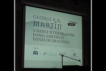Una hora antes de que comenzara ya había una cola considerable. Menos mal que finalmente no estuvimos en un mal lugar. George R. R. Martin vino a Barcelona para presentar Danza de dragones, la quinta novela de la serie Canción de Hielo y Fuego. El periodista Ricard Ruiz fue quien condujo la tarde con sus diversas preguntas. Se habló de la saga, se le preguntó sobre el significado del hielo y el fuego y de otras novelas suyas como Muerte de la luz y Sueño del Fevre. Incluso Ricard intentó que hablará sobre los dos siguientes de la saga, pero Martin sabe perfectamente lo que tiene y no que decir. Después se abrió la veda de preguntas y hubo muchas manos alzadas, lástima que el tiempo que tenían era muy poco. Se habló de su otra saga que tiene relación con Poniente y el mundo de Canción de Hielo y Fuego, sobre que se hayan hecho cómics y que pronto pueden traer esos libros a España. Al acabar George R. R. Martin pidió disculpas por no poder firmar libros ni hacerse una foto con cada uno de nosotros (¡recordad que éramos 700!) pero si que aceptó hacerse una foto con los que asistieron al evento disfrazados de los personajes.