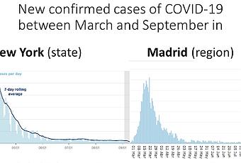 Miguel Hernán explica con dos gráficos como las dos ciudades tuvieron una evolución similar, con un gran pico de casos en marzo. Tras decretar confinamientos para evitar el colapso sanitario, la New York ha conseguido mantener plana su curva mientras que en Madrid la situación es catastrófica.