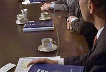 Imagen: US Cabinet MTG. Dominio Público. Fuente: Wikipedia. United States Cabinet: President George W. Bush answers a question from the reporter at the end of a Cabinet Meeting to discuss his energy plan, Wednesday May 16, 2001. WHITE HOUSE PHOTO BY ERIC DRAPER