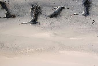 Cuca Arsuaga: Vuelo de cigüeñas. Acuarela y tinta. Tomada de aquí.