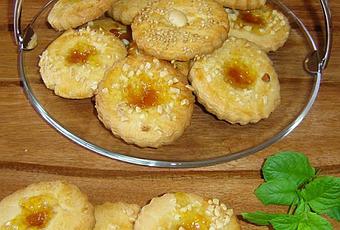 Hacemos un hoyito con el dedo índice en el centro de cada ghoriba, rellenamos ese hoyito con mermelada. Dejar un poco de espacio entre las pastas.