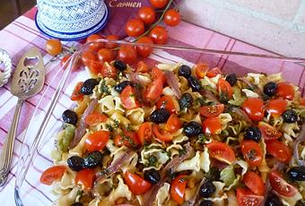 - Disponer por encima las anchoas, los tomatitos cherry cortados a cuartos, las aceitunas y unas cucharaditas de salsa pesto.