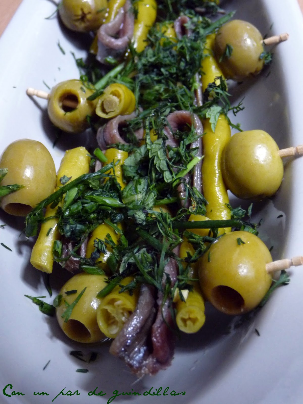 1.- Pues básicamente ensartamos con cuidado en un palillo aceitunas, trozos de piparras y buenas anchoas.