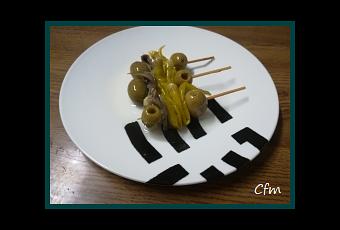 -Insertamos en un palillo una aceituna, dos guindillas, una antxoa y terminamos con otra aceituna-Las ponemos en un plato y regamos con aceite de oliva