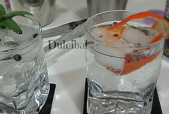 - Decorar la copas colocando la hierbabuena en la copa del enebro y la piel de mandarina en la de la pimienta.