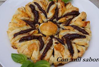 No os pasa en alguna ocasiones que tenéis idea de hacer un plato y a medida que lo vais preparando la idea va tornando en otra cosa distinta?, si?, pues eso es lo que me ha pasado a mi con este hojaldre!!!!. En principio pensé en hacer la típica estrella de hojaldre que tenemos por la red, pero yo que soy muy dada a las manualidades de toda la vida, fue empezar a cortar en tiras el hojaldre y aquello que te vas entusiasmando y cortas por aquí y por allá y te pones a unir y unir y no ves el momento de parar...... Pues porque no tenía más hojaldre si no te compongo el cuadro de los girasoles de Van Gogh.Aunque nunca hago el paso a paso por falta de tiempo, esta vez os lo he fotografiado pues pensé que esto era algo más complicado para algunos, así que ahí os lo dejo.Esta entrada va dedicada a mi amigo Enrique, que dice que estoy muy floja con el blog últimamente y tiene toda la razón del mundo, pero no he repetido entradas Enrique, mira que no te llevo más degustaciones, eh?, ja,ja..Ingredientes:Dos planchas de hojaldre(para cuatro girasoles pequeños, individuales como el mio).Crema de cacao (Nocilla, nutela....lo que más os guste).Huevo (para pintar el hojaldre).