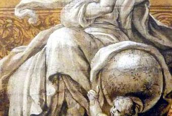 Las imágenes alegóricas femeninas hacen referencia a las artes y las ciencias, como muestra la Astronomía con telescopio y globoceleste, o la Geometría con compás.
