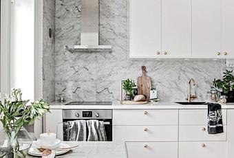 A la propietaria de este estudio le encanta el glamour, el estilo nórdico y el art decó y así lo ha plasmado en la decoración. Muebles que mezclan metal y cristal, mucha luz natural, flores y plantas frescas, textiles en cada rincón, mármol de Carrara en la cocina de muebles blancos… todos estos elementos son característicos de este tipo de decoraciones.