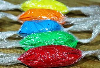 Repartimos en trozos de film de cocina la cantidad de glasa de delinear que necesitemos y enrollamos como caramelos, para luego meterlos en distintas mangas con boquillas del nº 2.
