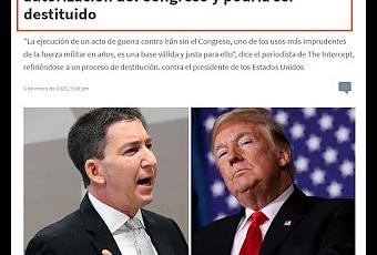 El presidente de Estados Unidos, Donald Trump, ha realizado un acto de guerra sin consultar al Congreso, y esto puede ser una razón de juicio político, advirtió el viernes 3 de periodista estadounidense Glenn Greenwald, fundador The Intercept en Brasil."Si quieres que Trump sea enjuiciado, ejecutar un acto de guerra contra Irán sin el Congreso, uno de los usos más imprudentes de la fuerza militar en años, es una base válida y justa para eso", dijo el periodista en Twitter.